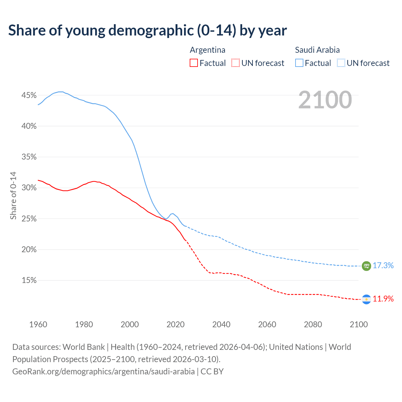 - The share of young demographic (0-15 years old) in Argentina is 21.6% vs 23.8% in Saudi Arabia.
