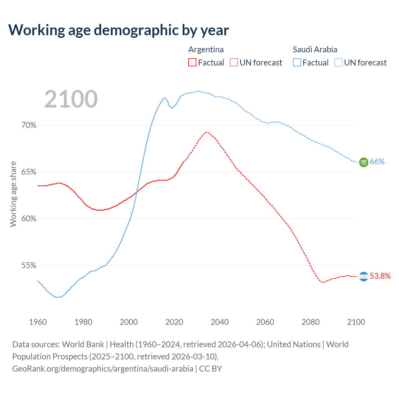 - Argentina has 30.4M working age adults (aged 15-64) vs 26.9M in Saudi Arabia.