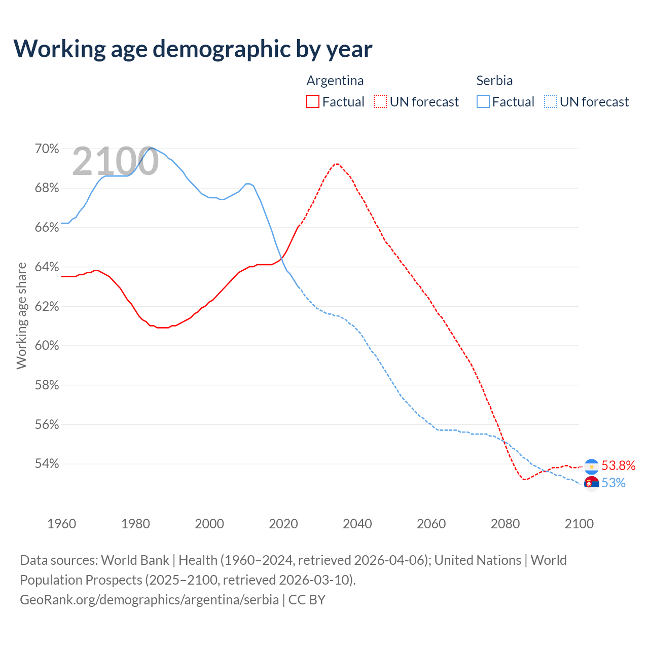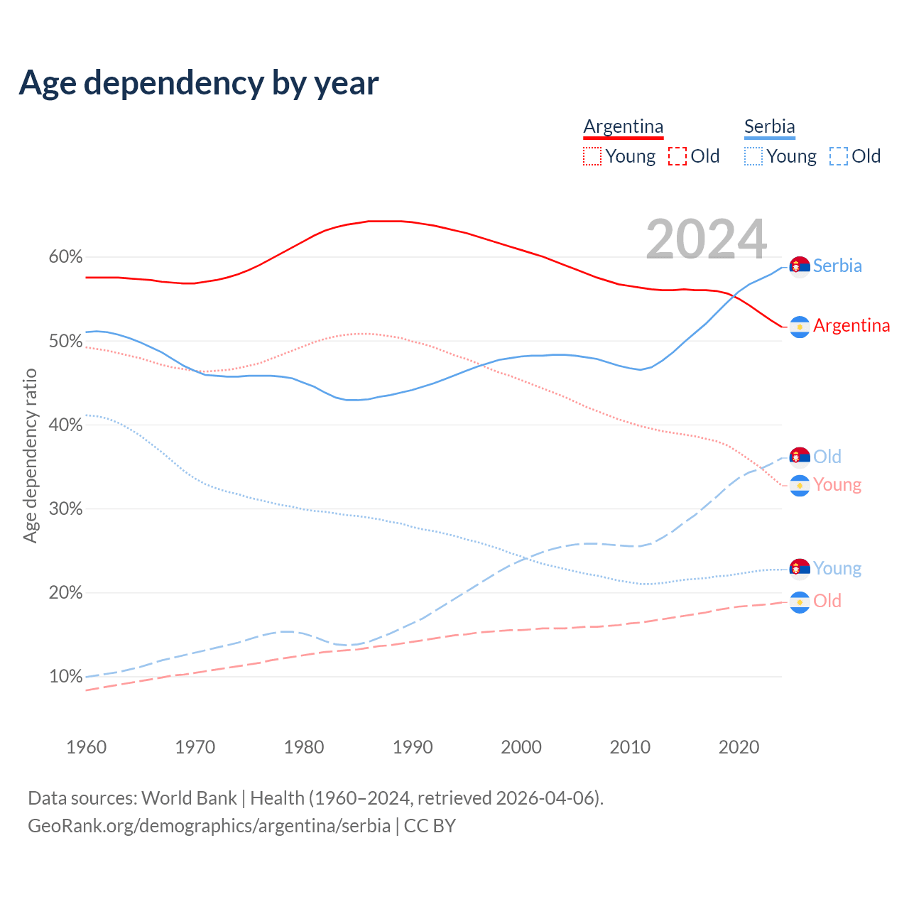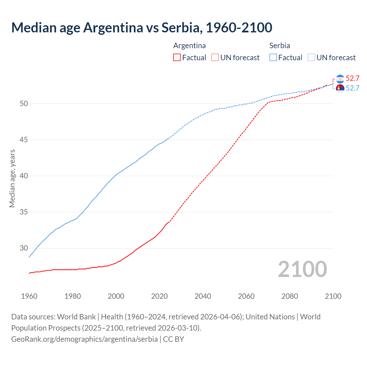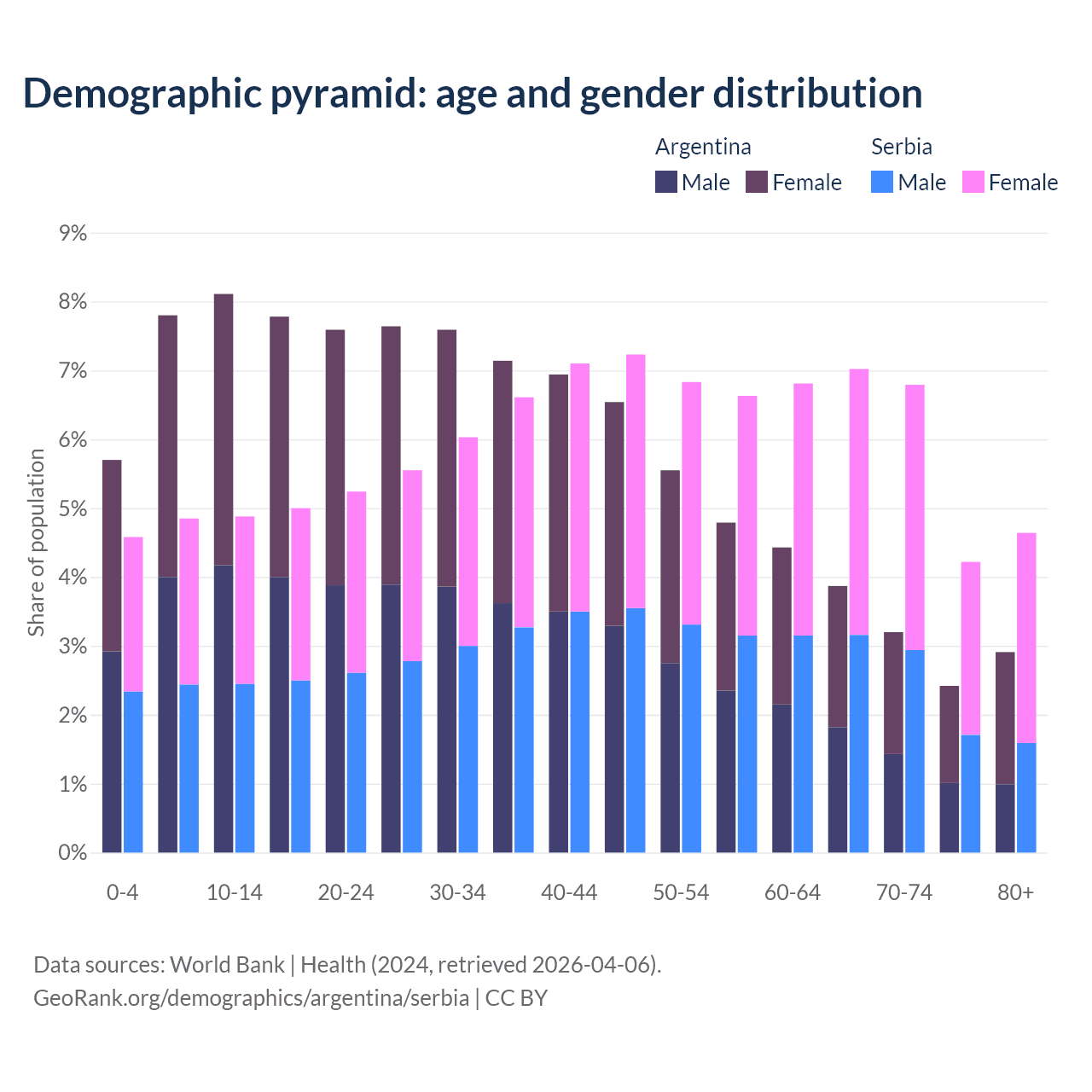 - Argentina is ranked 85/196 by median age (oldest to youngest) vs 15/196 for Serbia.
