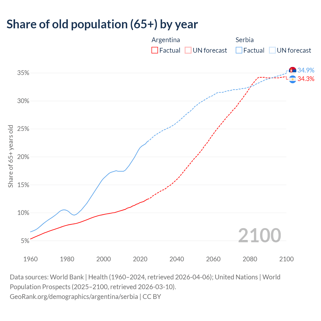 The share of older people aged 65 and over is 12.4% in Argentina and 22.7% in Serbia. Life expectancy in Argentina compared to Serbia .
