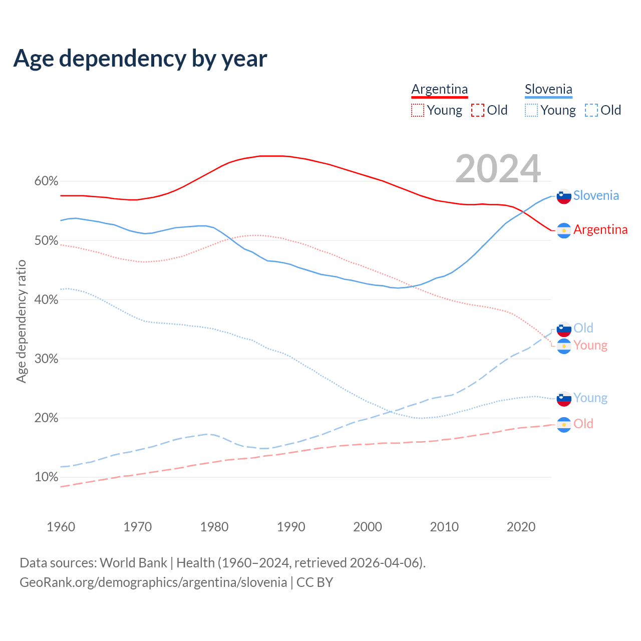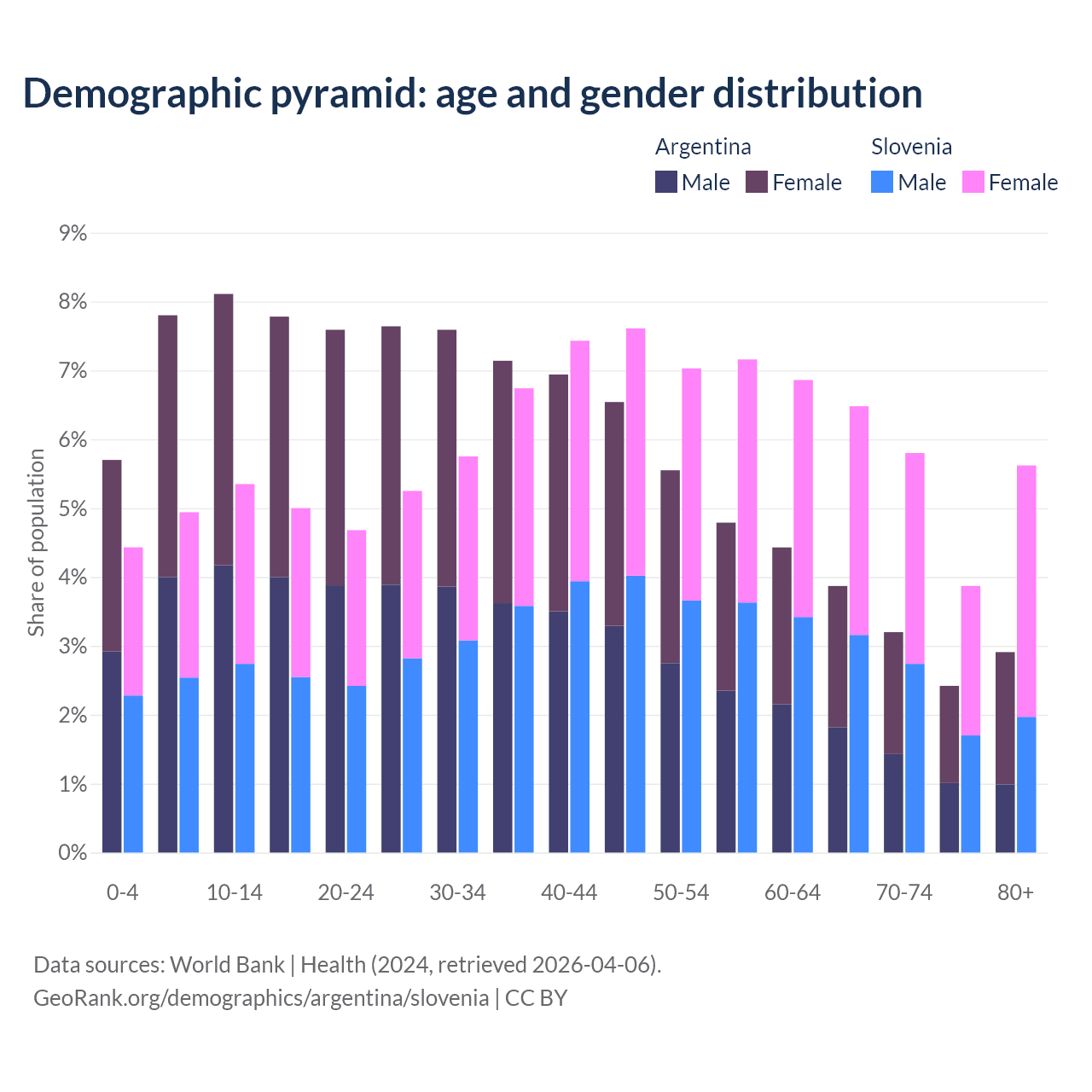 - Argentina is ranked 85/196 by median age (oldest to youngest) vs 14/196 for Slovenia.