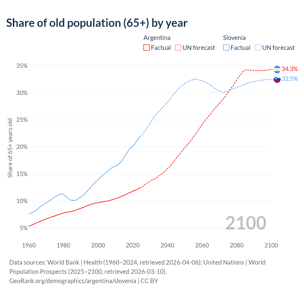 Median age Argentina vs Slovenia, 1960-2100