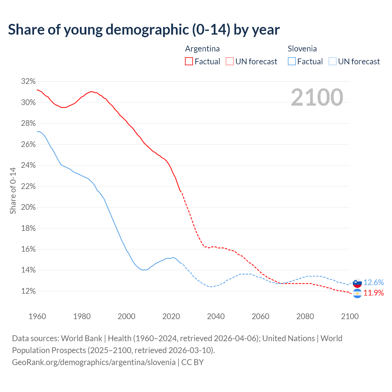 - The share of young demographic (0-15 years old) in Argentina is 21.6% vs 14.7% in Slovenia.