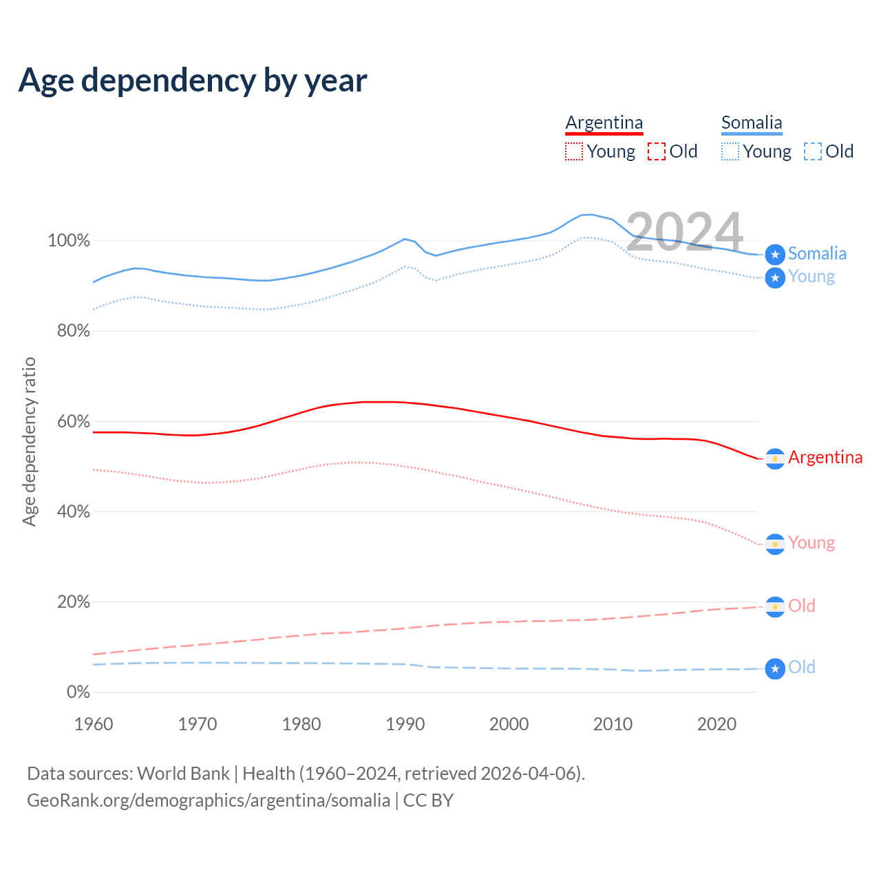 - Argentina is ranked 85/196 by median age (oldest to youngest) vs 194/196 for Somalia.