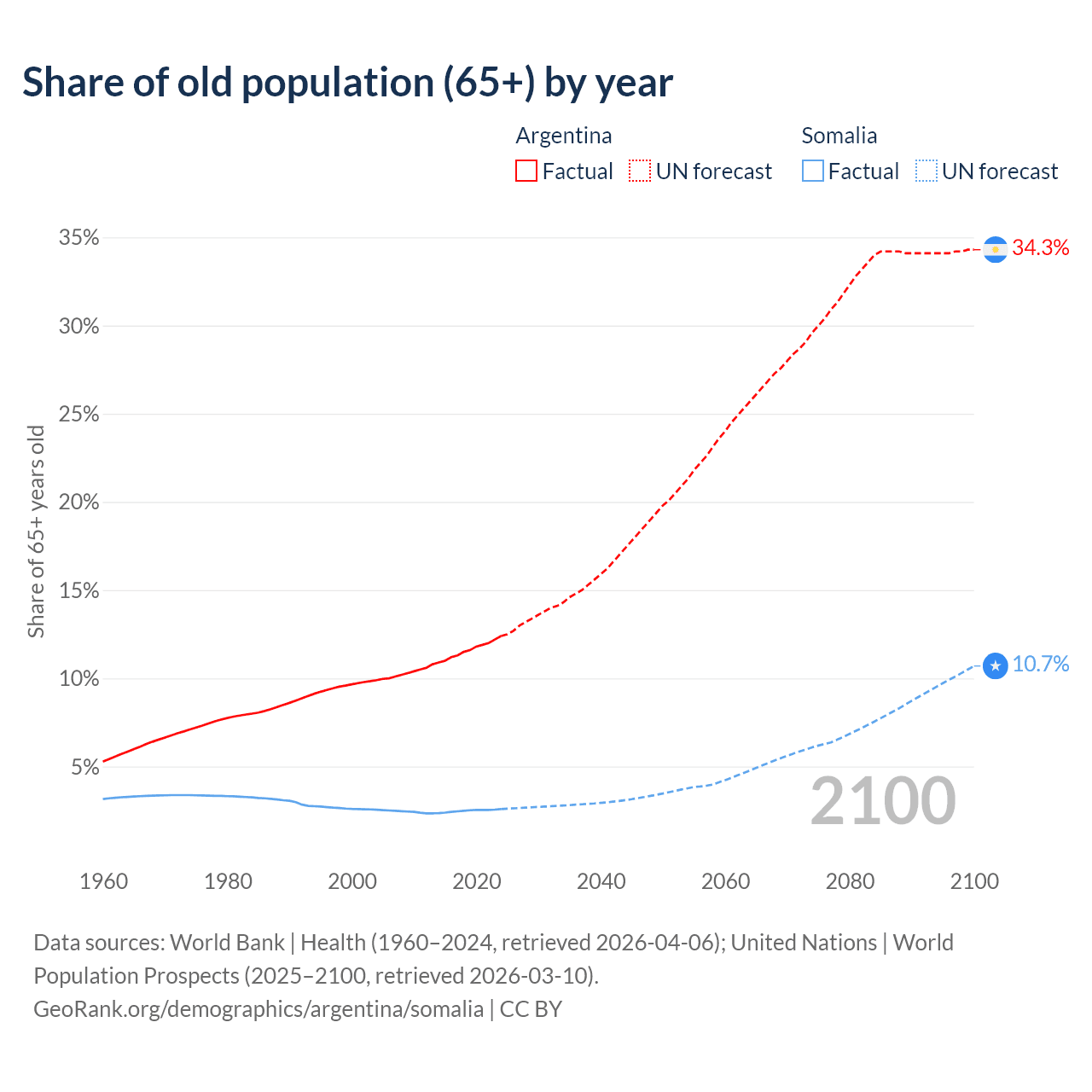 The share of older people aged 65 and over is 12.4% in Argentina and 2.59% in Somalia. Life expectancy in Argentina compared to Somalia .