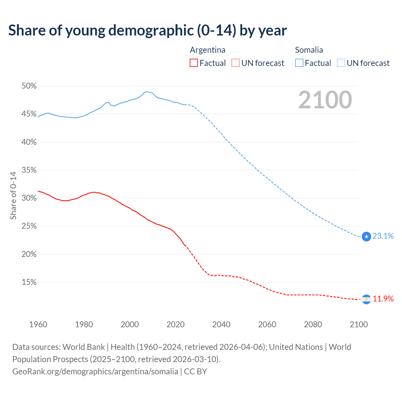 - The share of young demographic (0-15 years old) in Argentina is 21.6% vs 46.6% in Somalia.
