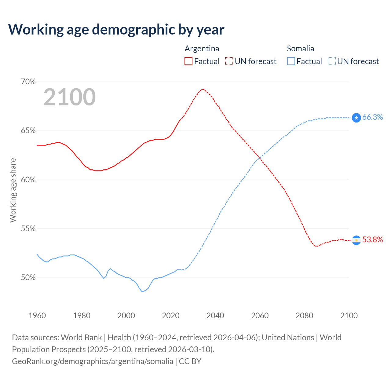 - Argentina has 30.4M working age adults (aged 15-64) vs 10.4M in Somalia.