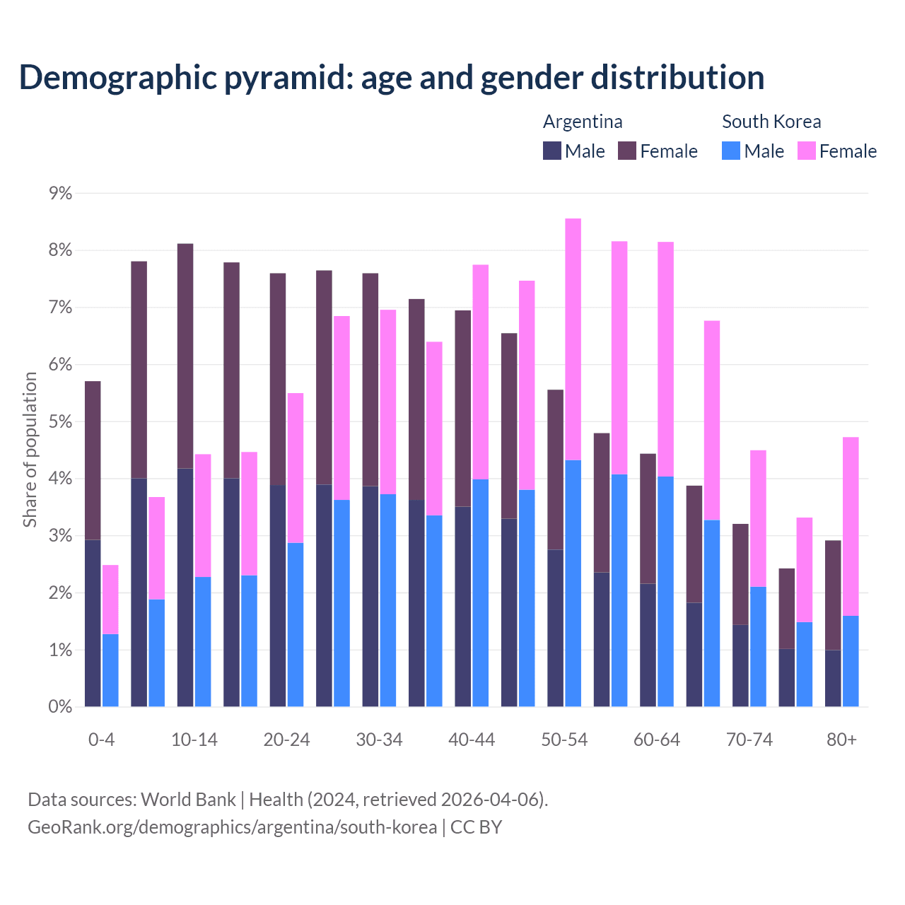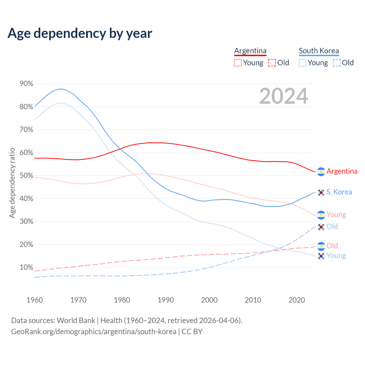 - Argentina is ranked 85/196 by median age (oldest to youngest) vs 10/196 for South Korea.