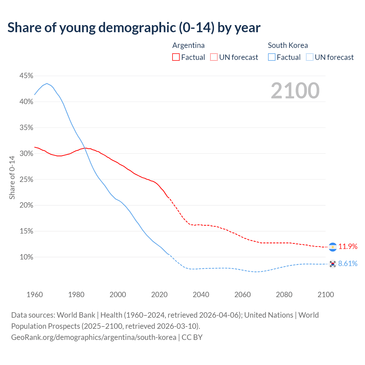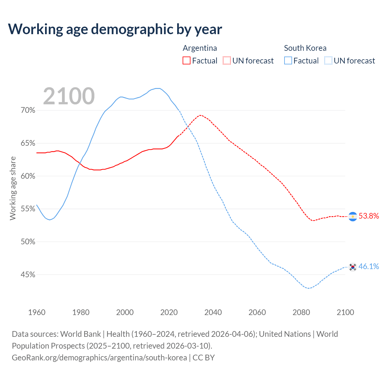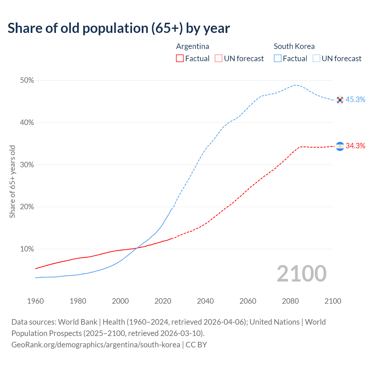Median age Argentina vs South Korea, 1960-2100