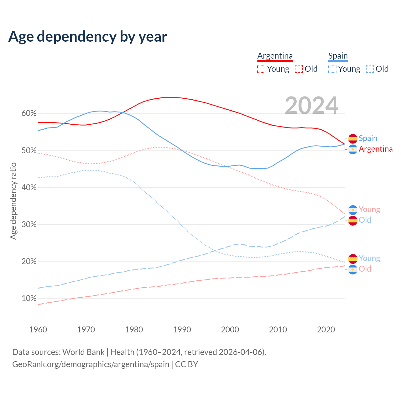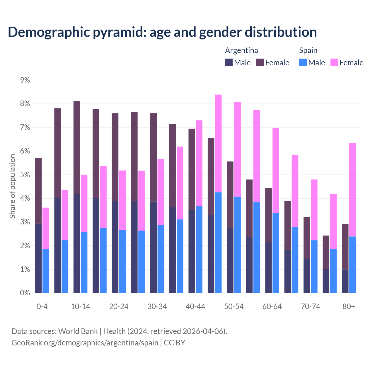 - Argentina is ranked 85/196 by median age (oldest to youngest) vs 7/196 for Spain.