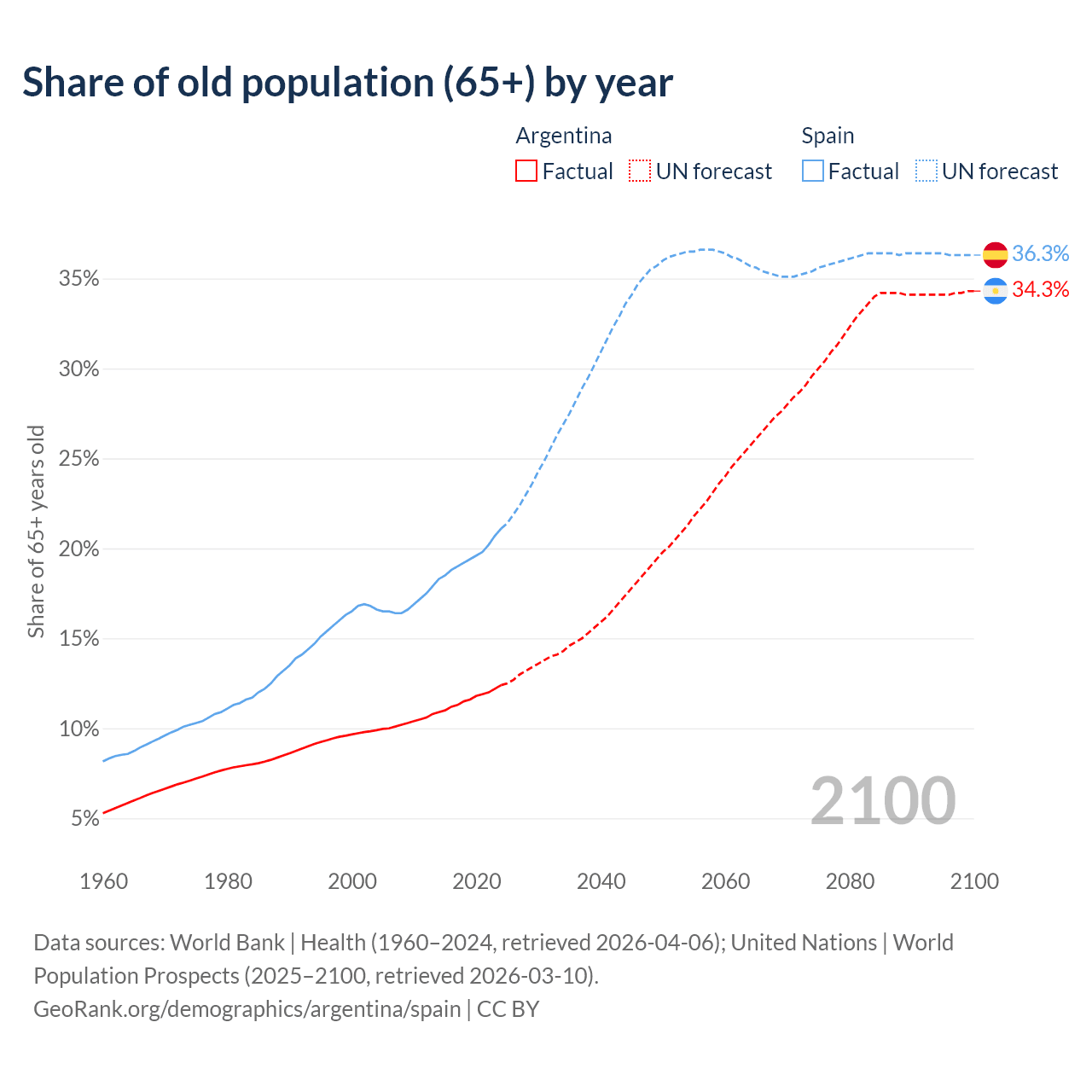 The share of older people aged 65 and over is 12.4% in Argentina and 21.1% in Spain. Life expectancy in Argentina compared to Spain .