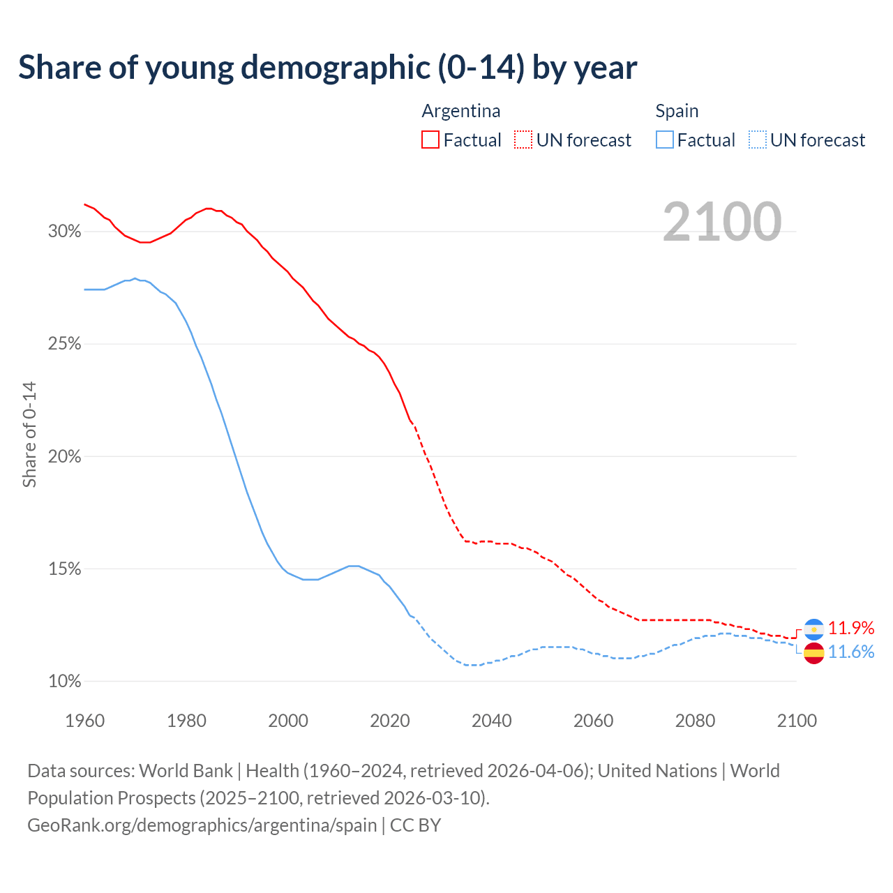 - The share of young demographic (0-15 years old) in Argentina is 21.6% vs 12.9% in Spain.