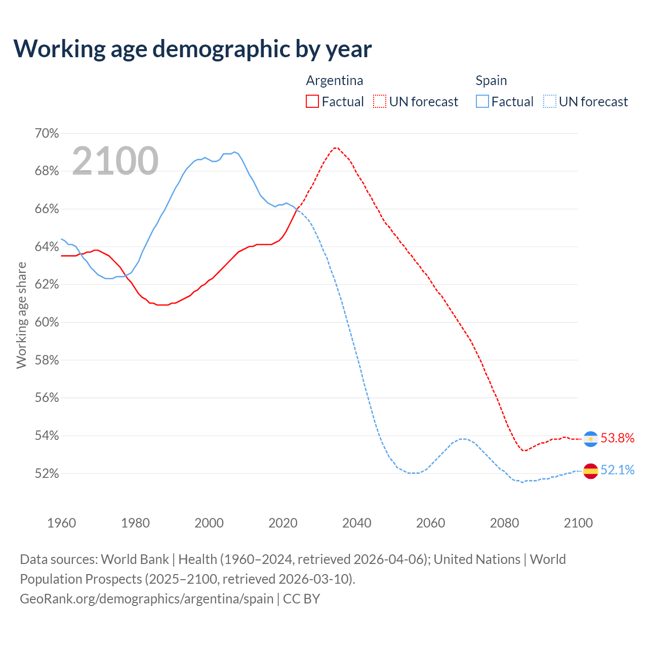Median age Argentina vs Spain, 1960-2100