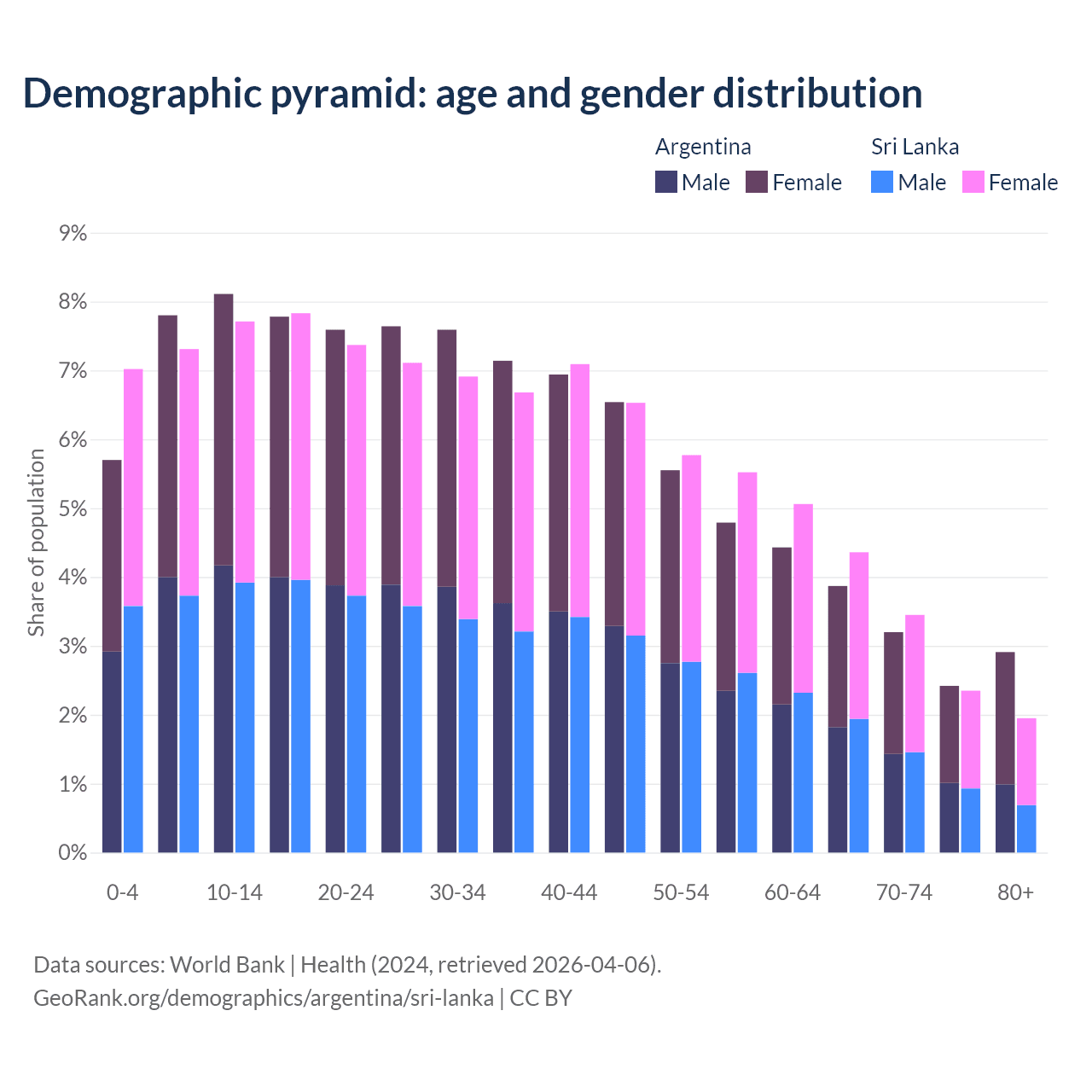 - Argentina is ranked 85/196 by median age (oldest to youngest) vs 81/196 for Sri Lanka.