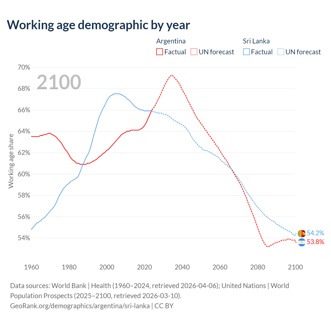 Median age Argentina vs Sri Lanka, 1960-2100