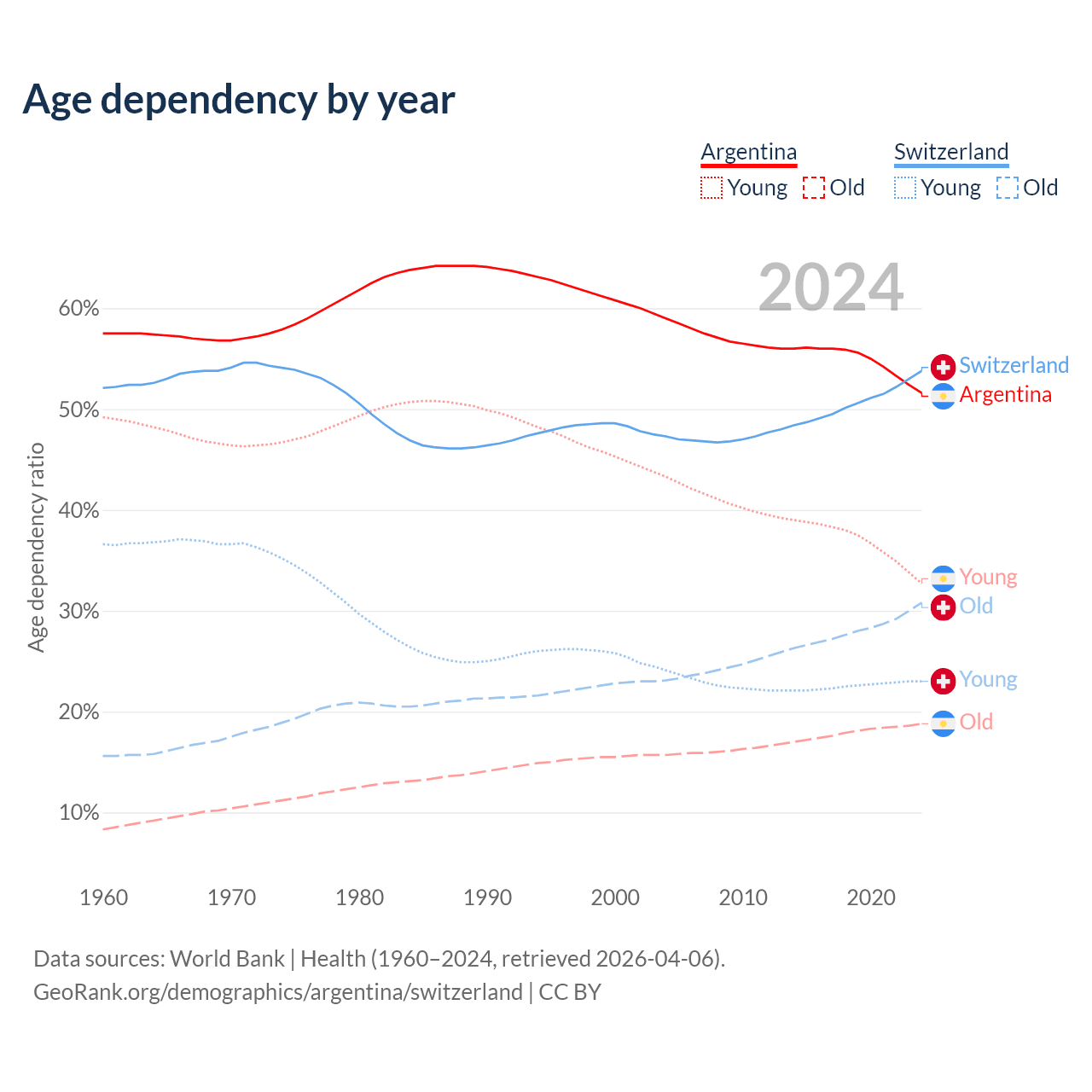 - Argentina is ranked 85/196 by median age (oldest to youngest) vs 24/196 for Switzerland.