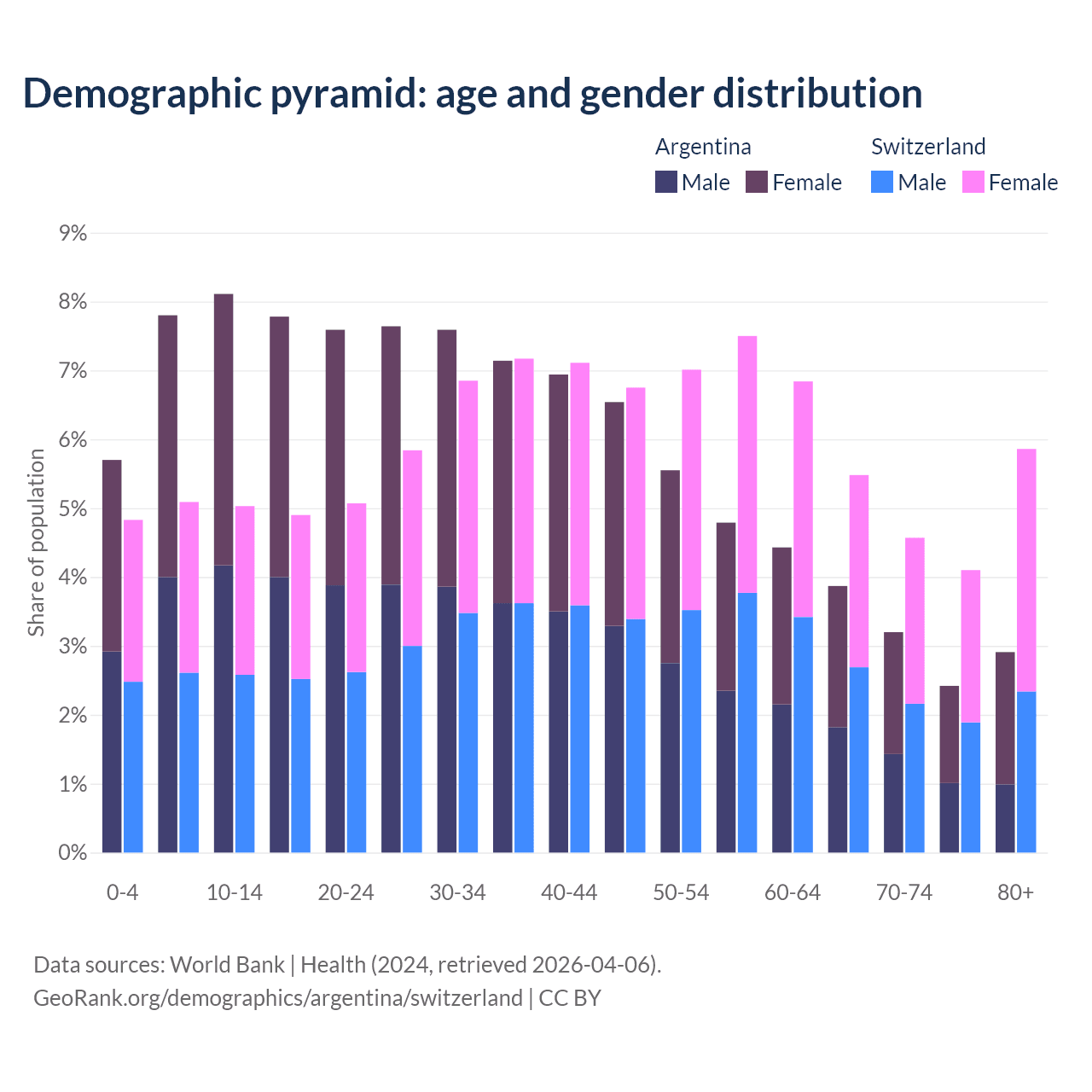 The share of older people aged 65 and over is 12.4% in Argentina and 20% in Switzerland. Life expectancy in Argentina compared to Switzerland .
