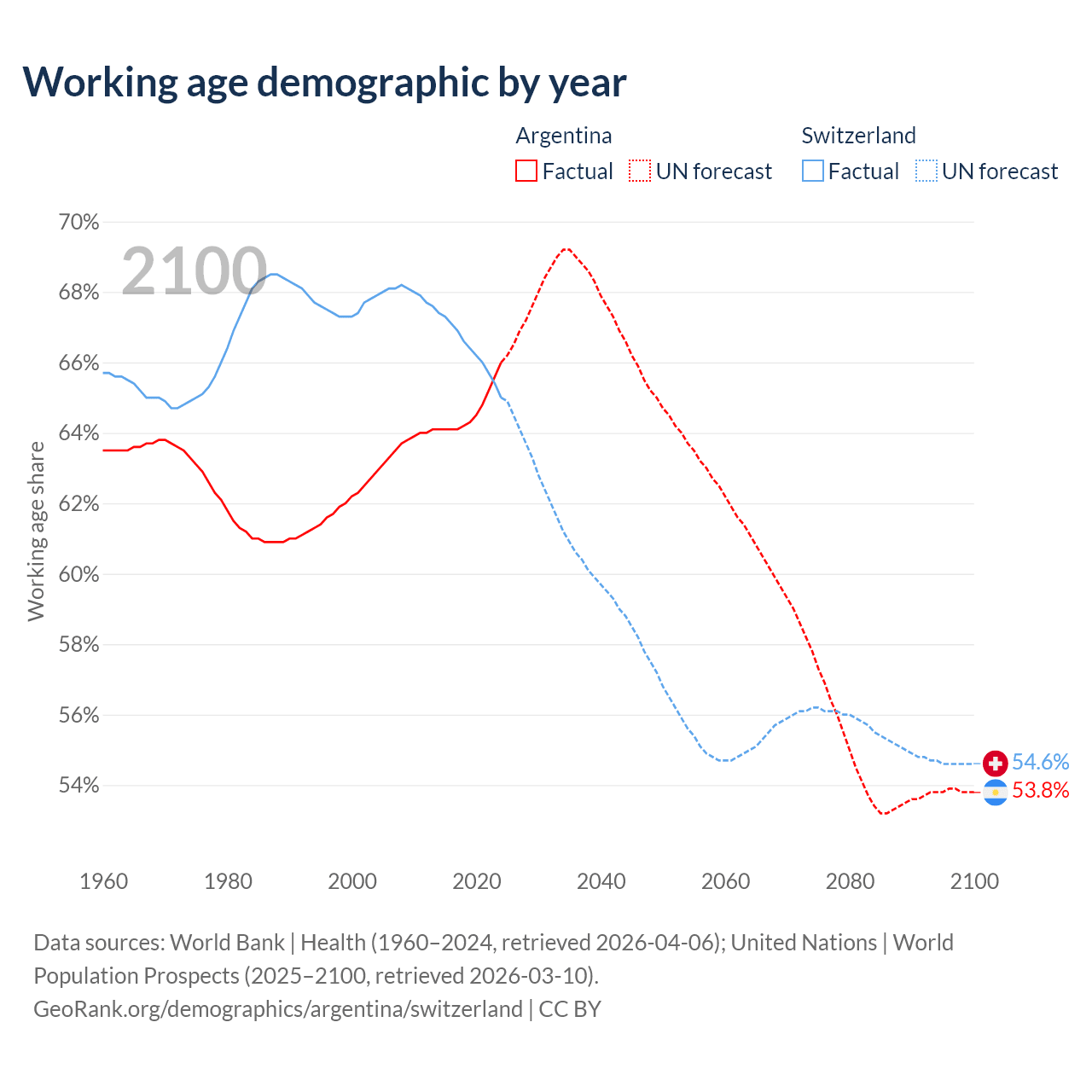 Median age Argentina vs Switzerland, 1960-2100