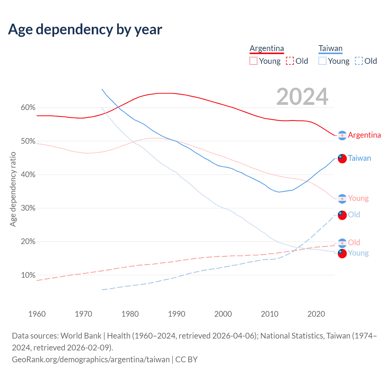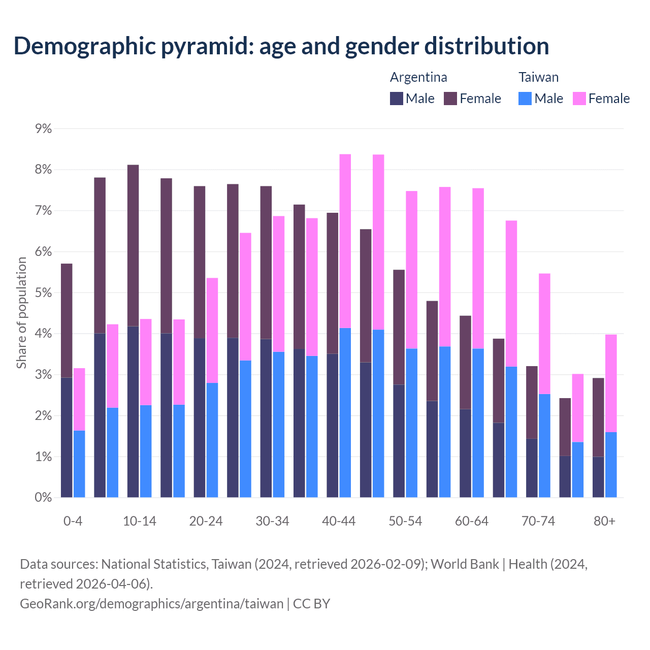 - Argentina is ranked 85/196 by median age (oldest to youngest) vs 16/196 for Taiwan.