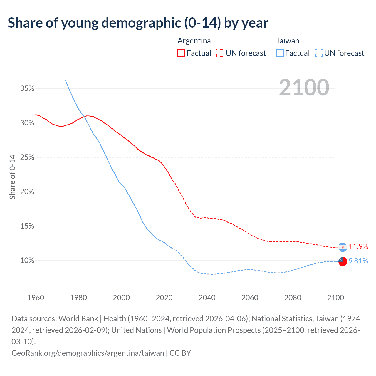 - The share of young demographic (0-15 years old) in Argentina is 21.6% vs 11.7% in Taiwan.