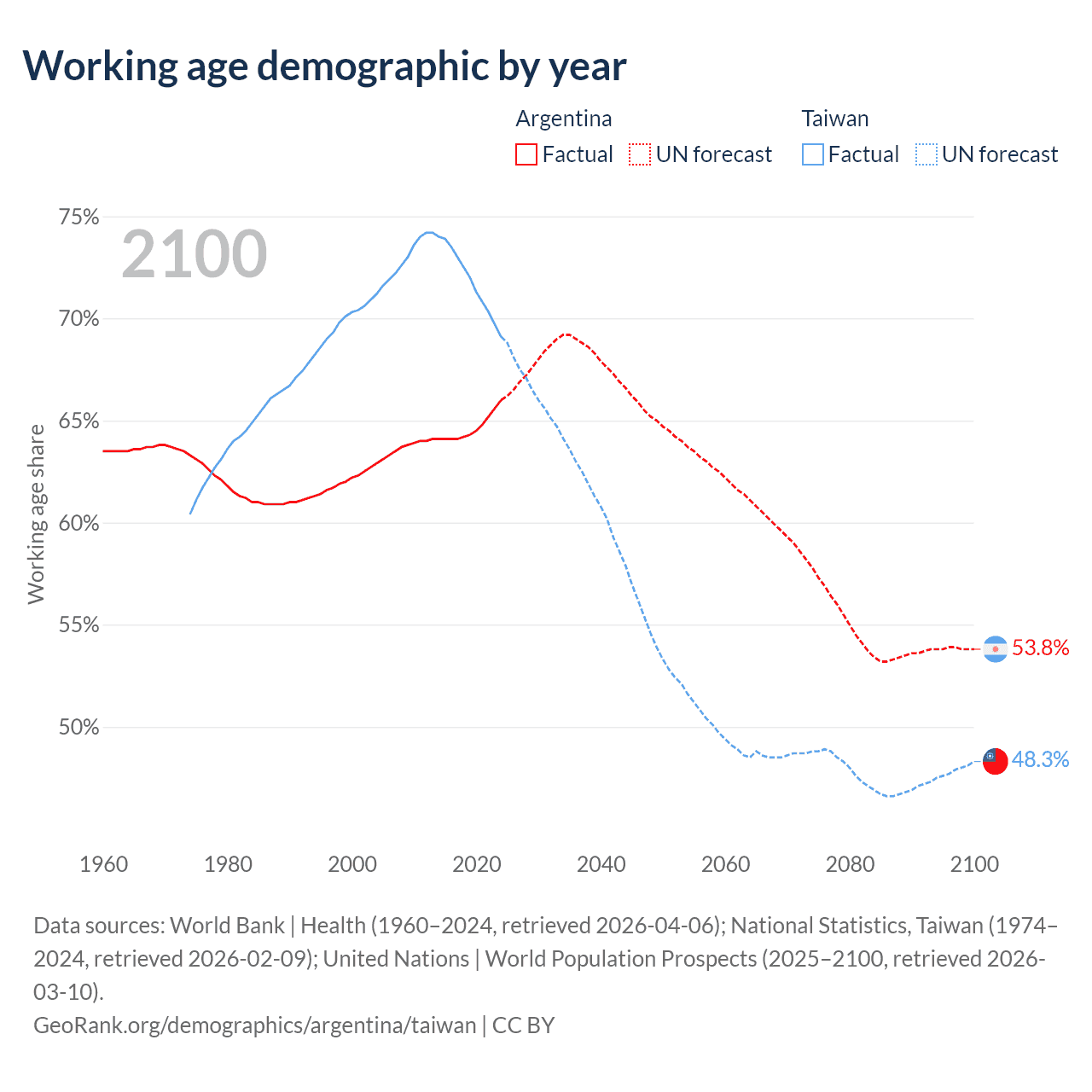 - Argentina has 30.4M working age adults (aged 15-64) vs 16.1M in Taiwan.