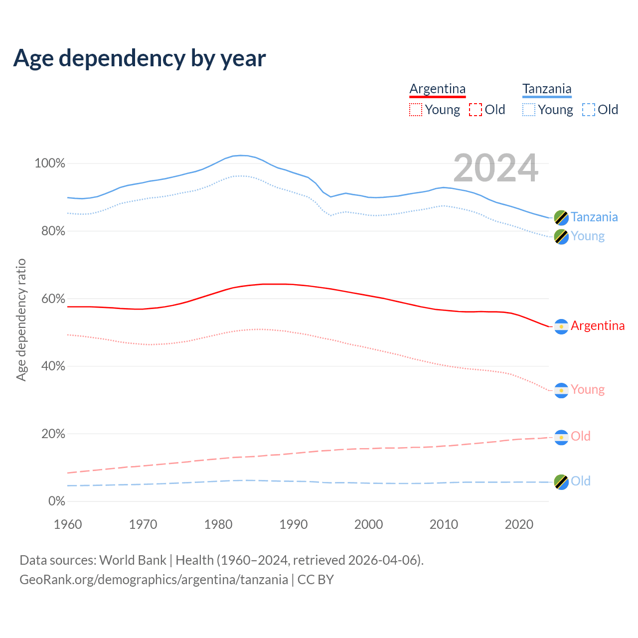 - Argentina is ranked 85/196 by median age (oldest to youngest) vs 184/196 for Tanzania.