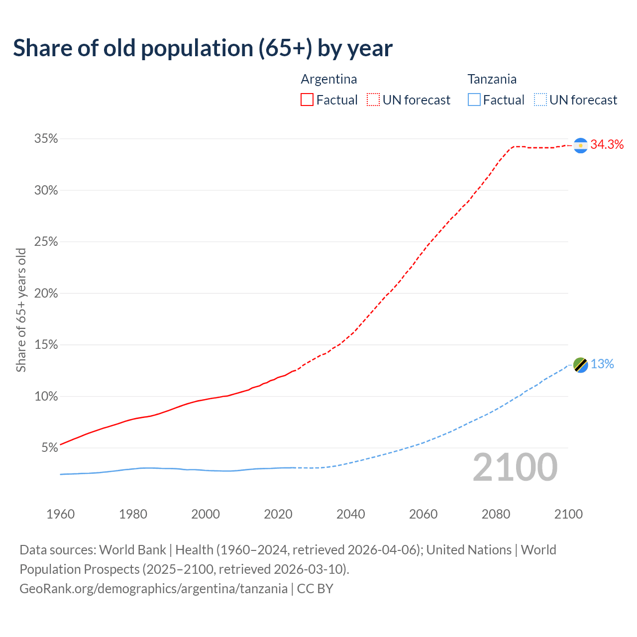 The share of older people aged 65 and over is 12.4% in Argentina and 3.05% in Tanzania. Life expectancy in Argentina compared to Tanzania .