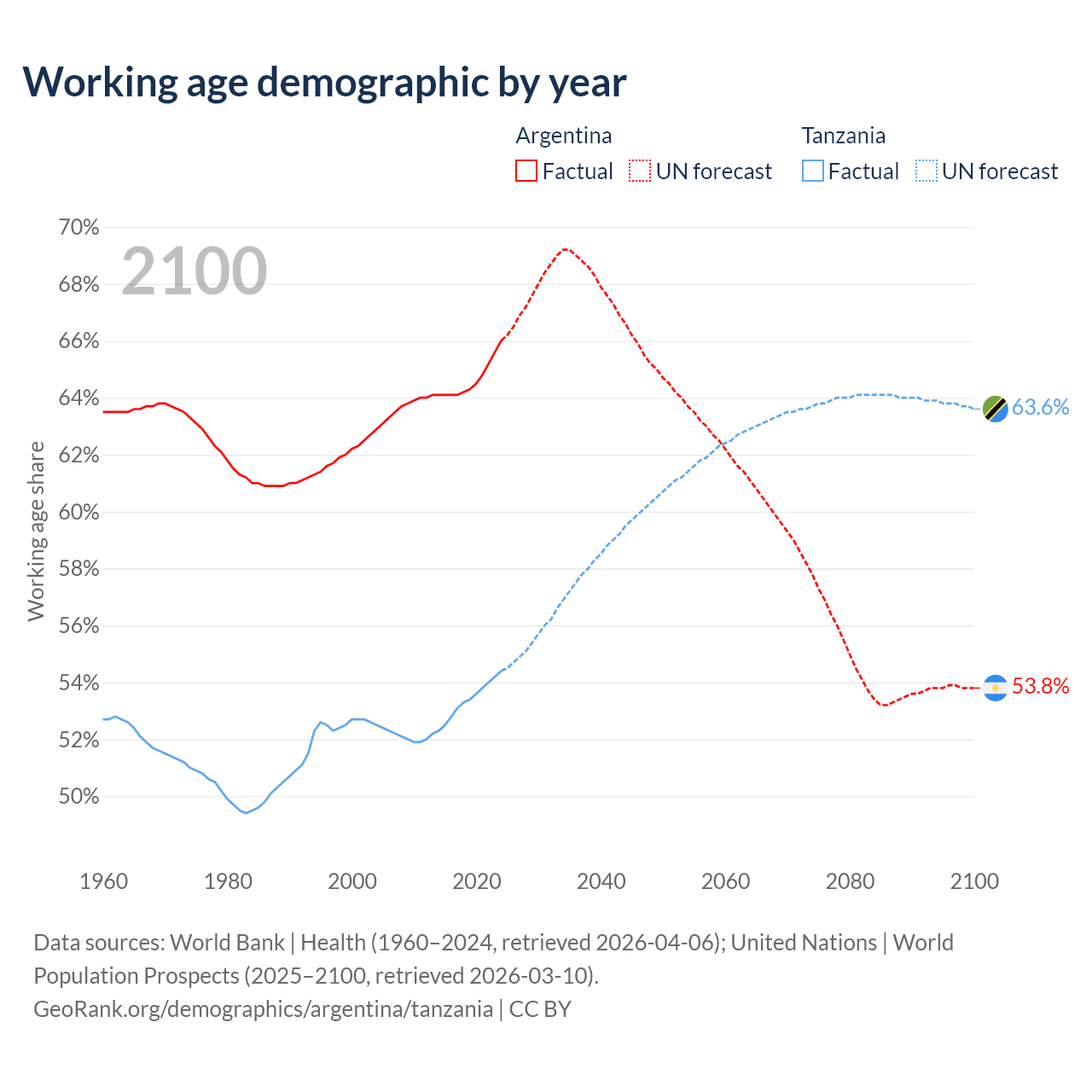 - Argentina has 30.4M working age adults (aged 15-64) vs 39.8M in Tanzania.
