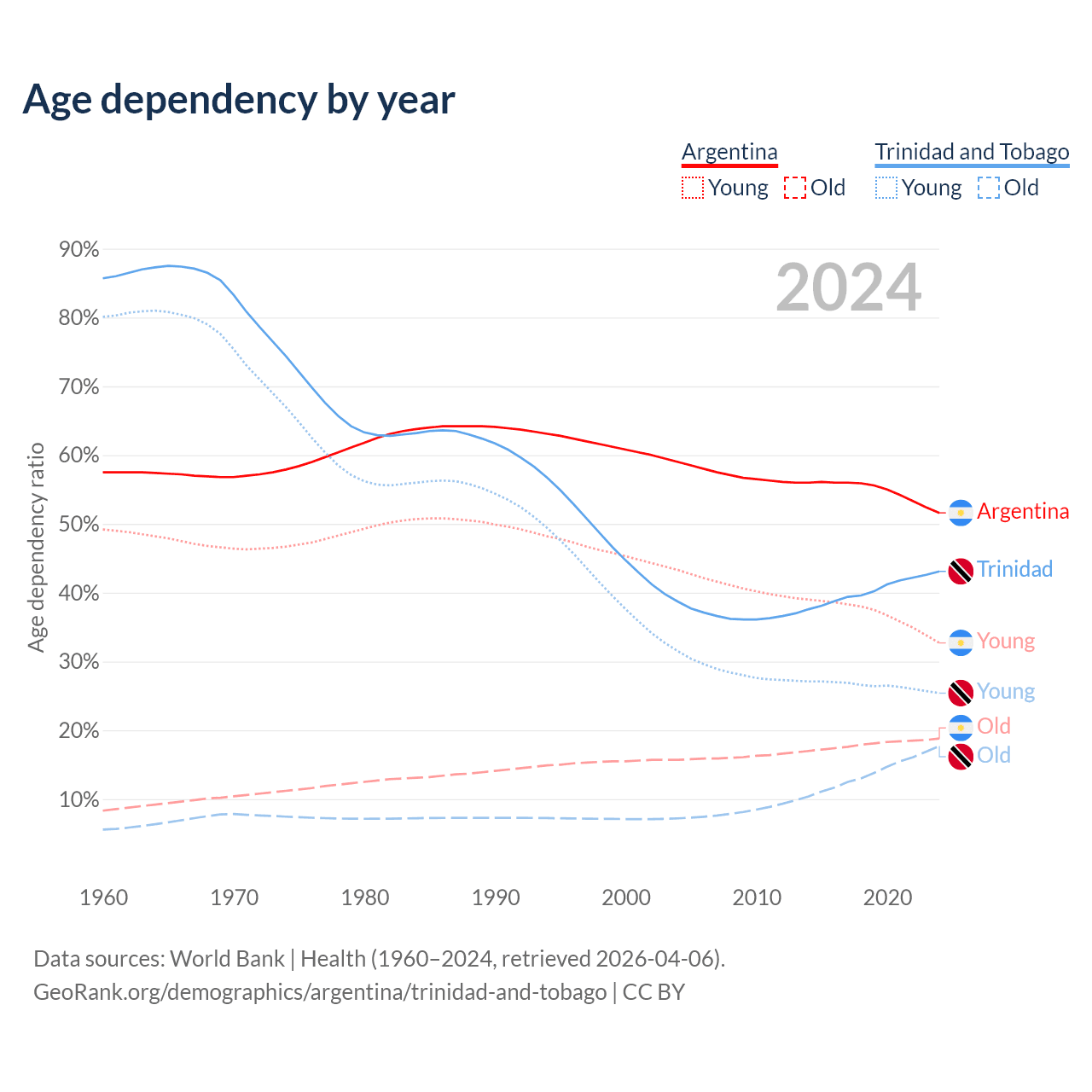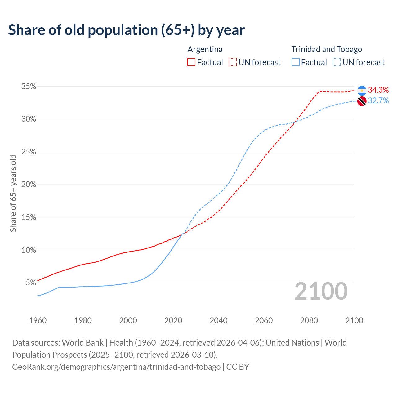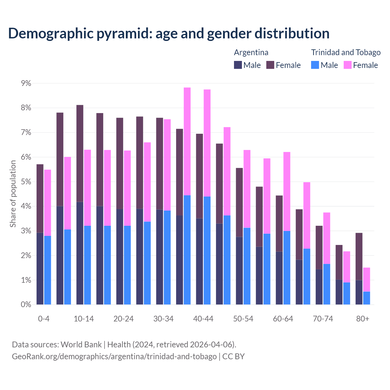 - The share of old-age demographic (65+) in Argentina is 12.4% vs 12.4% in Trinidad and Tobago.