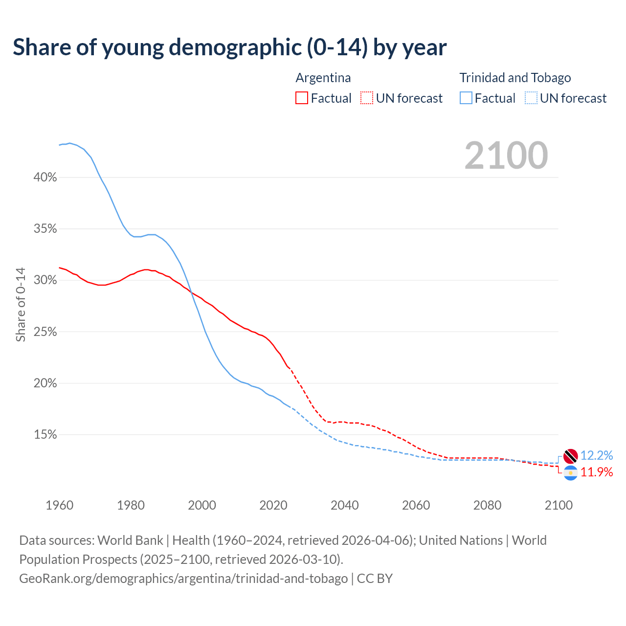 - The share of young demographic (0-15 years old) in Argentina is 21.6% vs 17.8% in Trinidad and Tobago.
