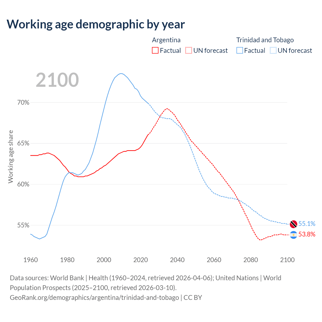 Median age Argentina vs Trinidad and Tobago, 1960-2100