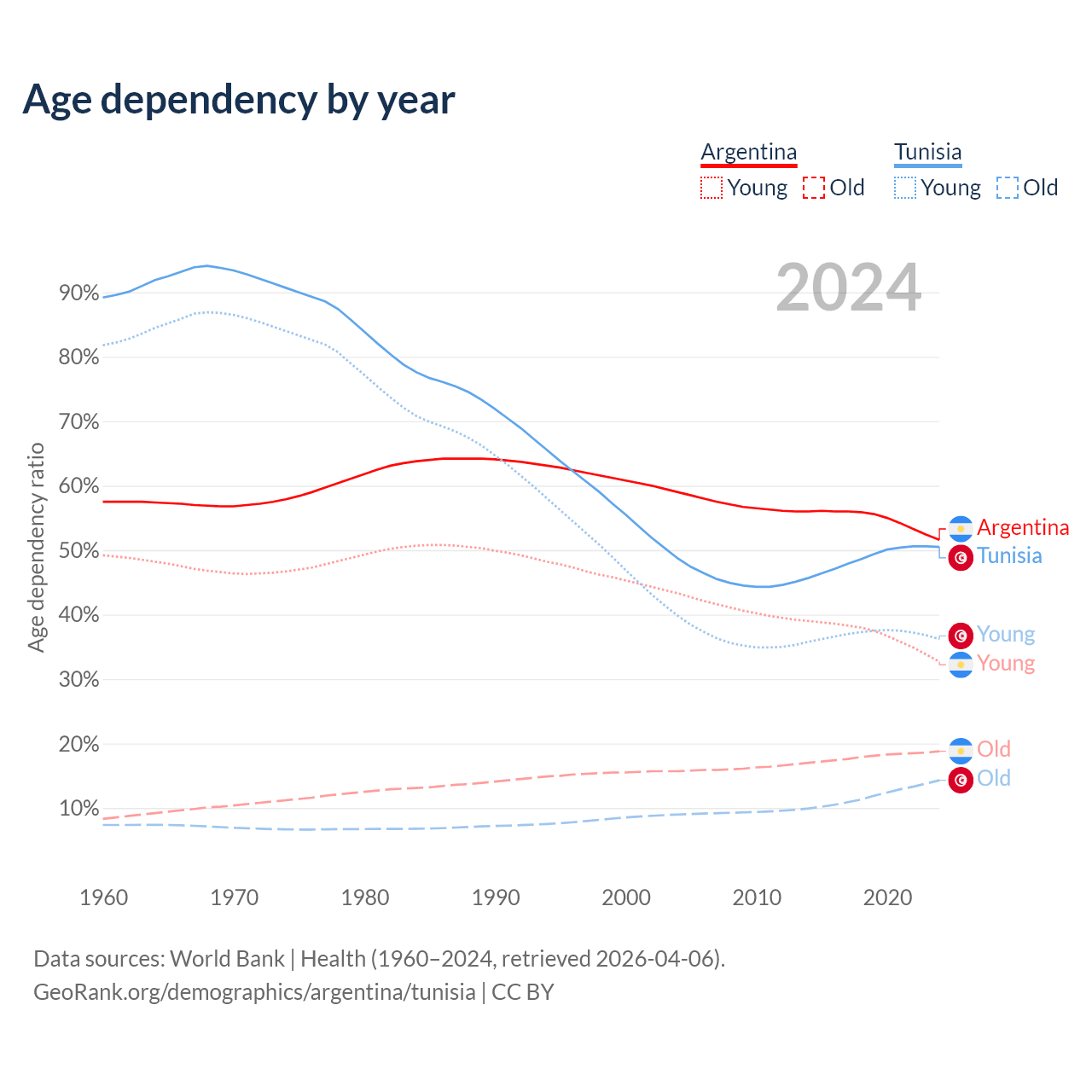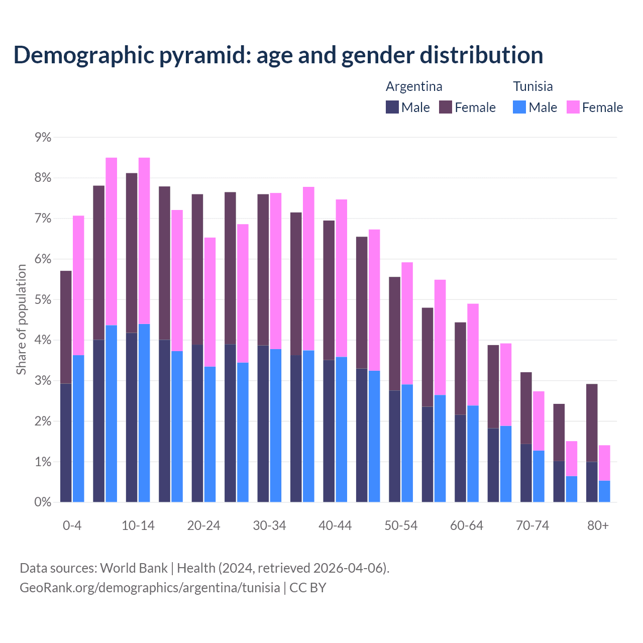 - Argentina is ranked 85/196 by median age (oldest to youngest) vs 86/196 for Tunisia.
