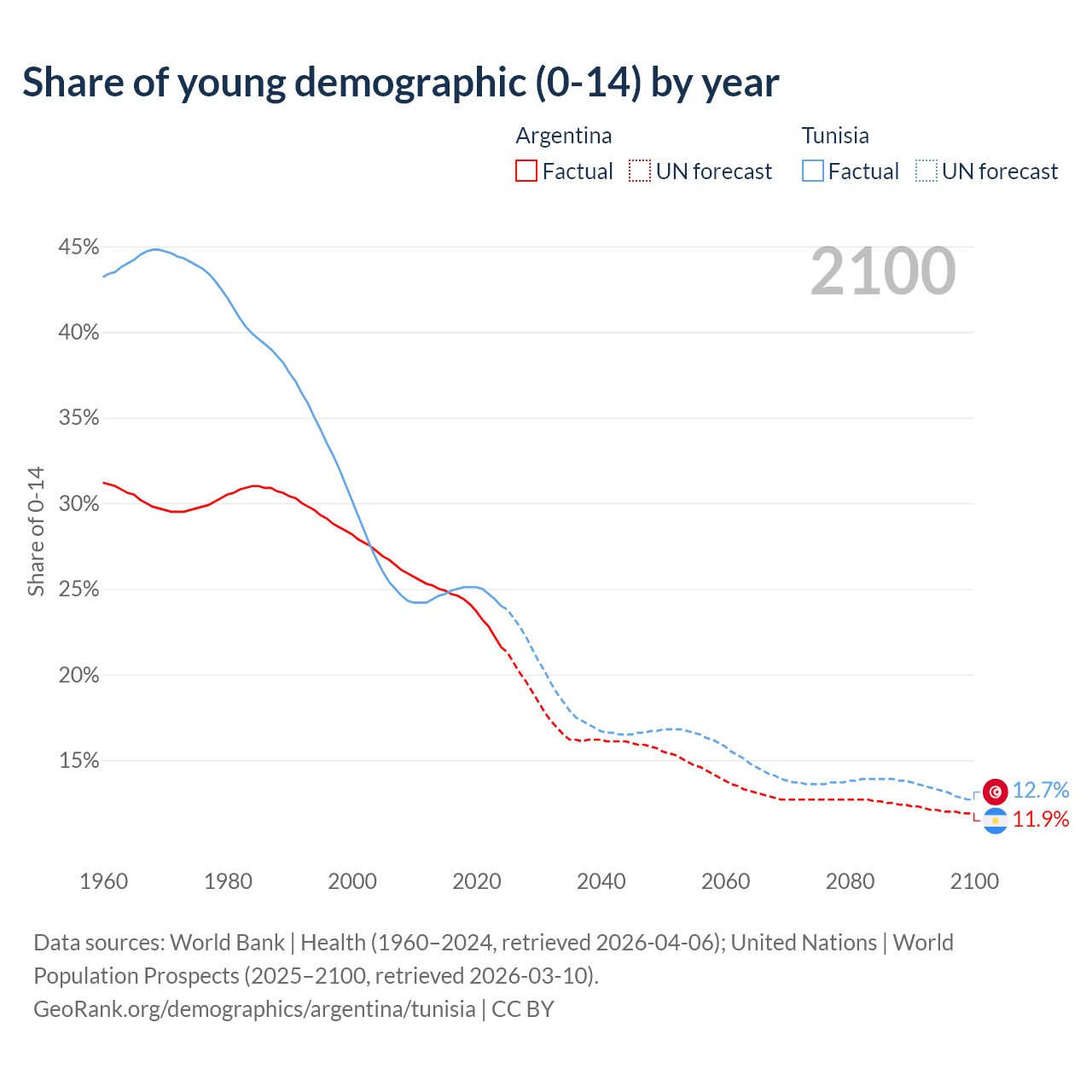 - As of 2026, the population of Argentina is 46M vs 12.4M in Tunisia - 3.7 times difference.