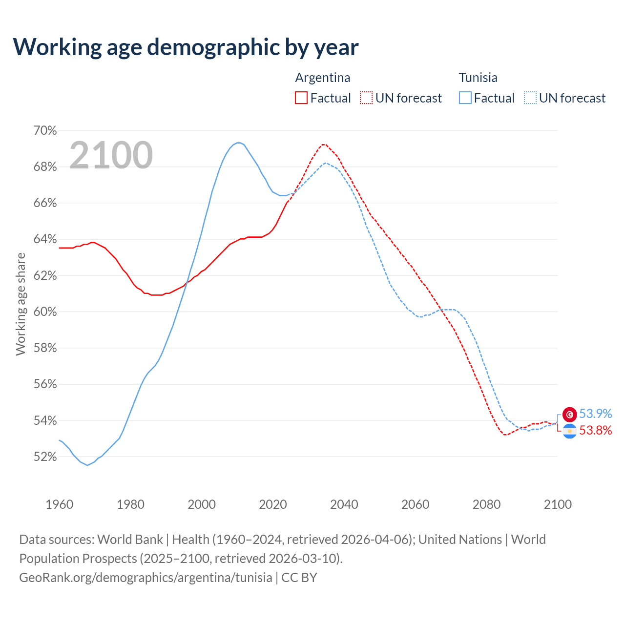- Argentina has 30.4M working age adults (aged 15-64) vs 8.26M in Tunisia.