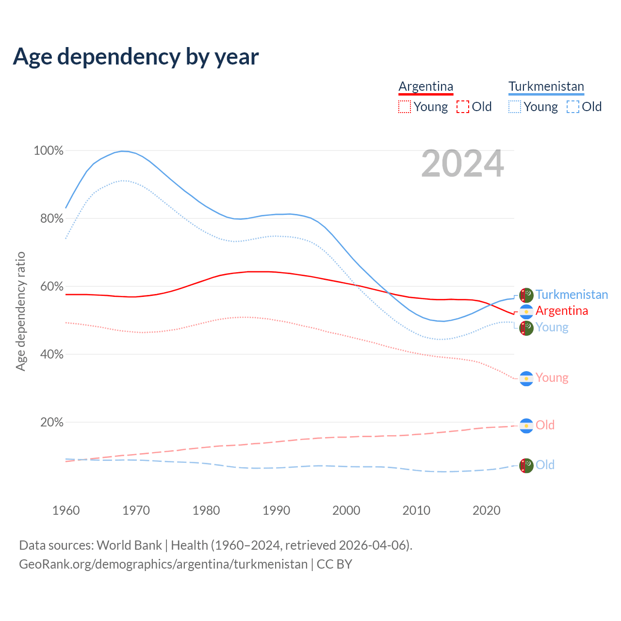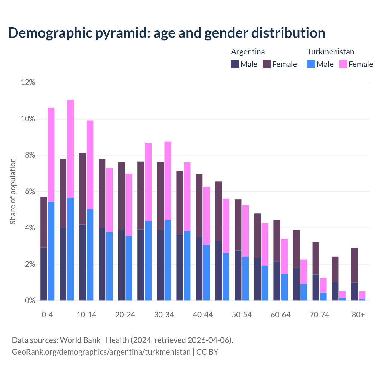 - Argentina is ranked 85/196 by median age (oldest to youngest) vs 119/196 for Turkmenistan.