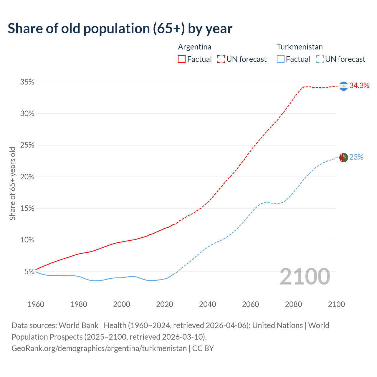 The share of older people aged 65 and over is 12.4% in Argentina and 4.53% in Turkmenistan. Life expectancy in Argentina compared to Turkmenistan .