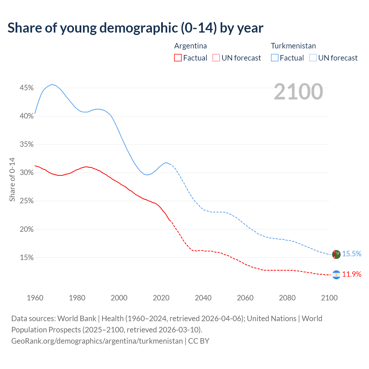 - The share of young demographic (0-15 years old) in Argentina is 21.6% vs 31.5% in Turkmenistan.
