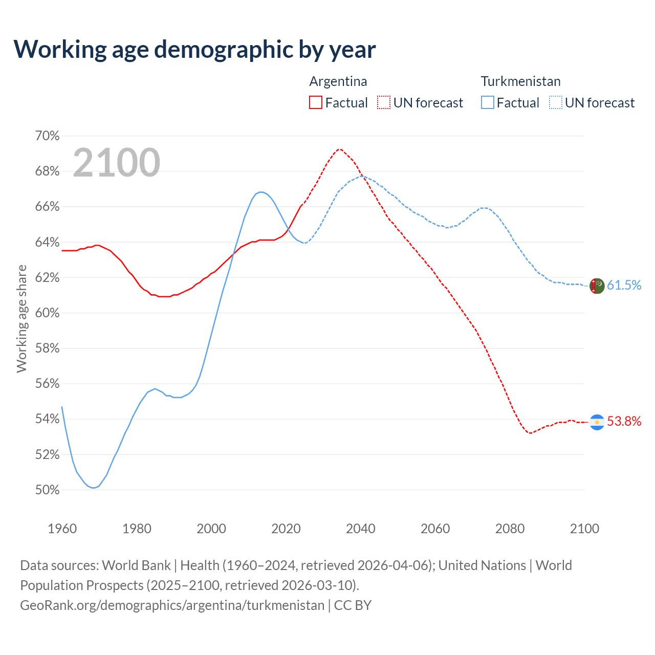 - Argentina has 30.4M working age adults (aged 15-64) vs 4.97M in Turkmenistan.
