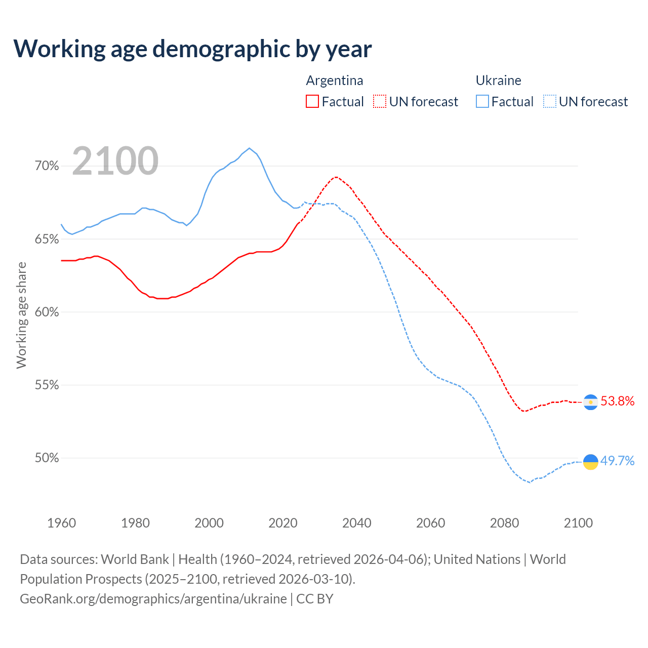 Median age Argentina vs Ukraine, 1960-2100