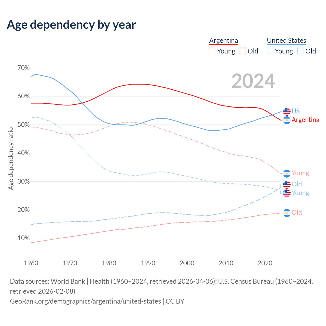 - Argentina is ranked 85/196 by median age (oldest to youngest) vs 50/196 for the United States.