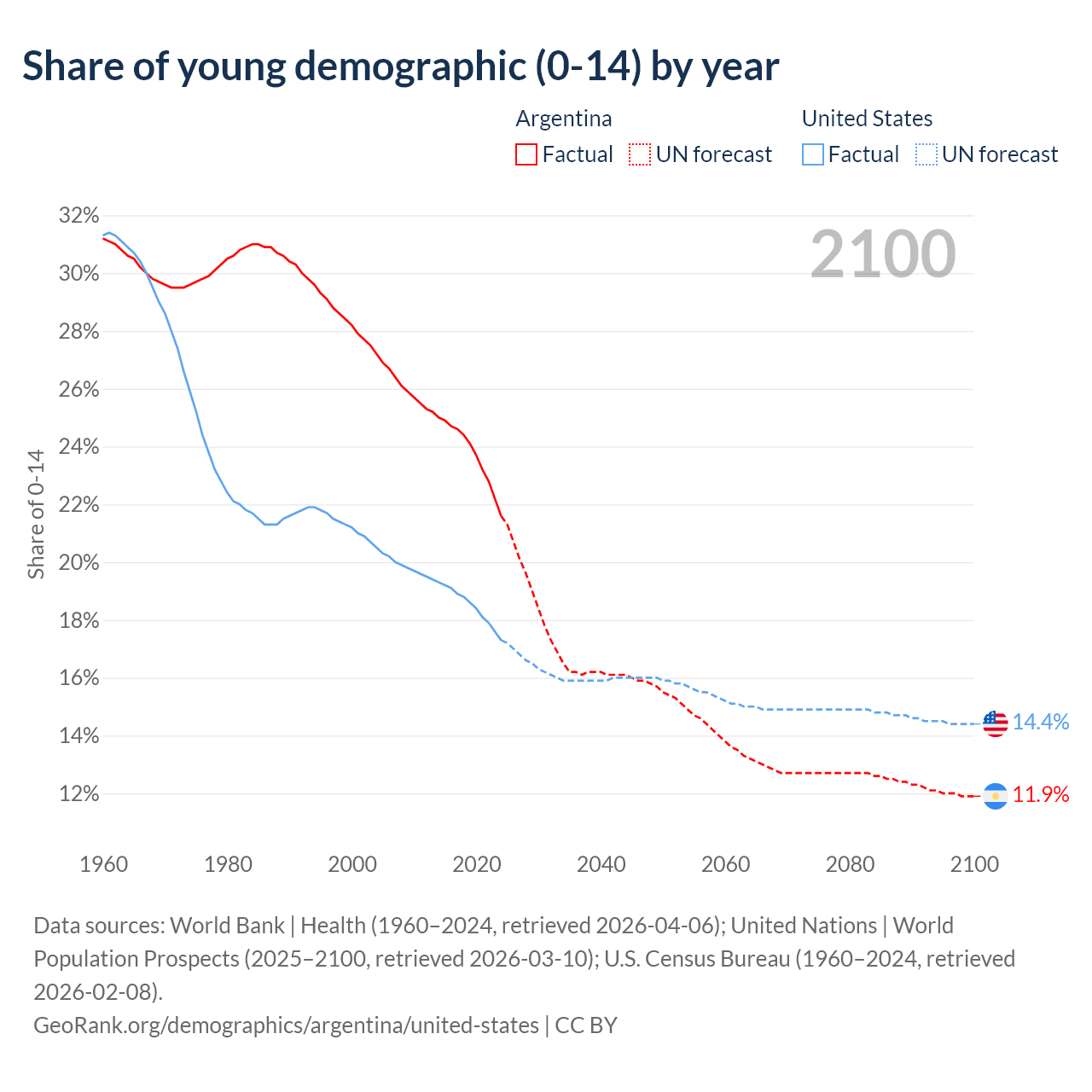 - The share of young demographic (0-15 years old) in Argentina is 21.6% vs 17.3% in the United States.