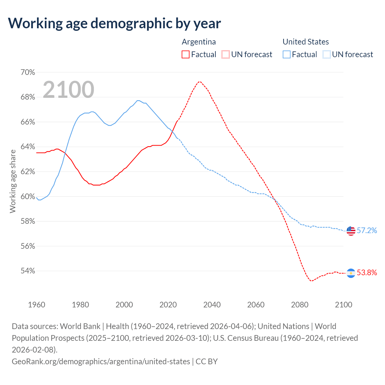 - Argentina has 30.4M working age adults (aged 15-64) vs 223M in the United States.