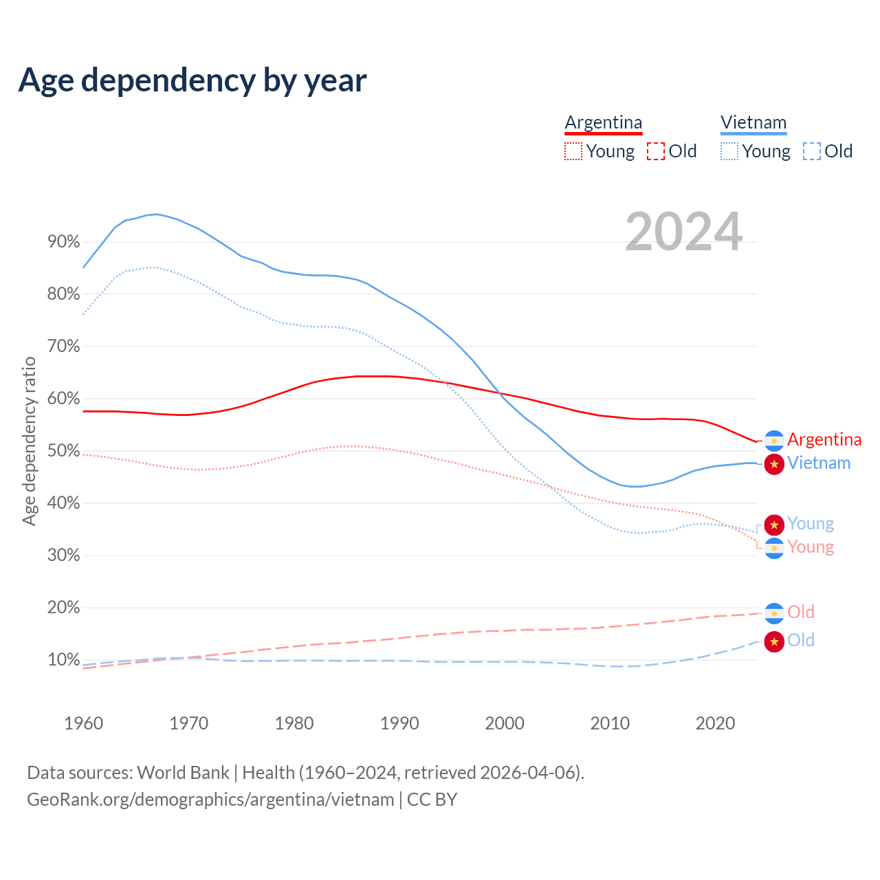 - Argentina is ranked 85/196 by median age (oldest to youngest) vs 84/196 for Vietnam.