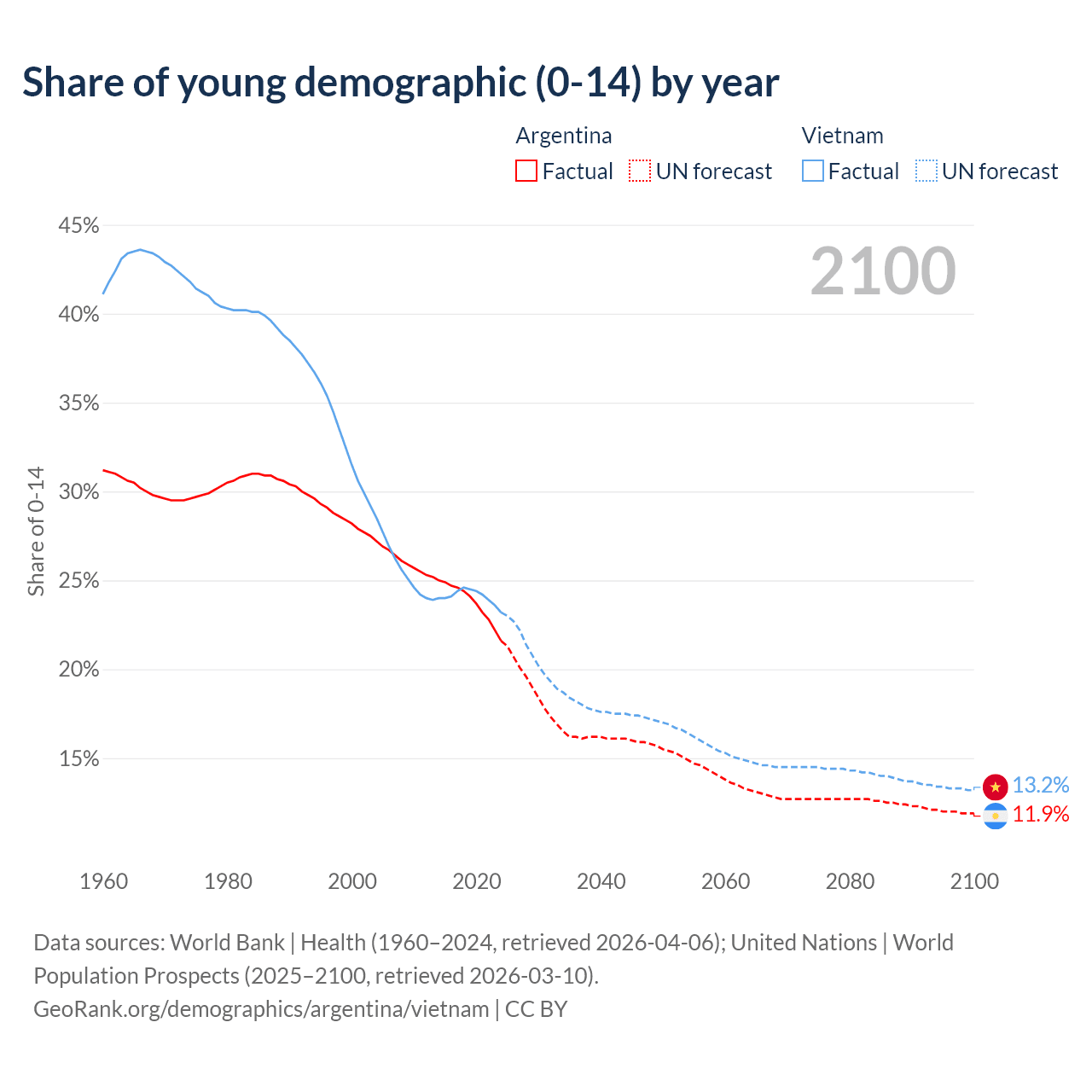 - As of 2026, the population of Argentina is 46M vs 102M in Vietnam - 2.22 times difference.