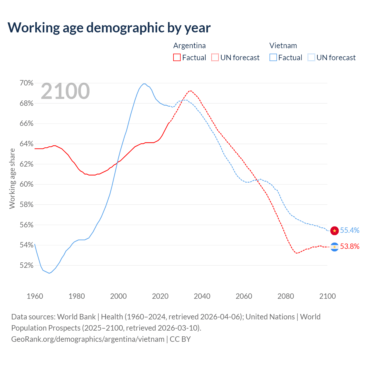 - Argentina has 30.4M working age adults (aged 15-64) vs 69.3M in Vietnam.