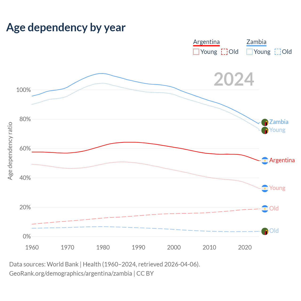 - Argentina is ranked 85/196 by median age (oldest to youngest) vs 182/196 for Zambia.