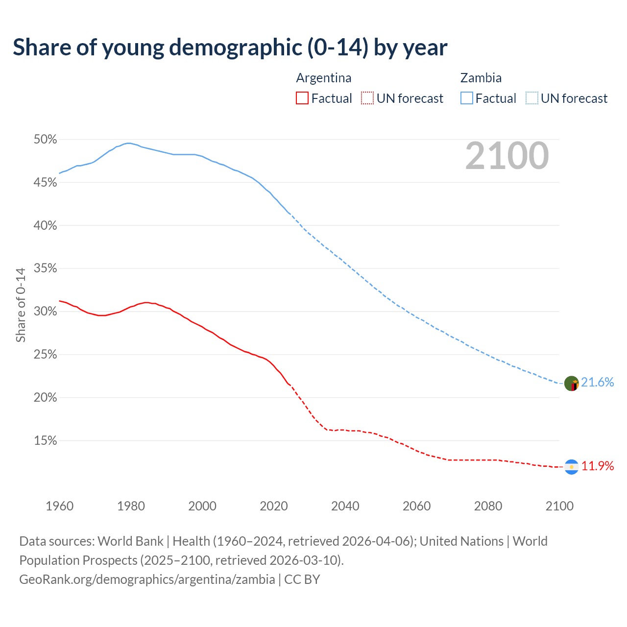 - The share of young demographic (0-15 years old) in Argentina is 21.6% vs 41.5% in Zambia.