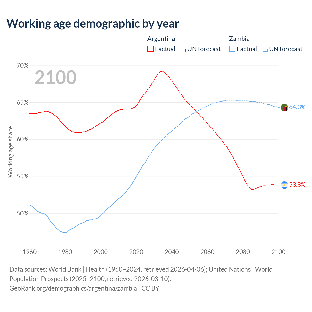 - Argentina has 30.4M working age adults (aged 15-64) vs 12.8M in Zambia.