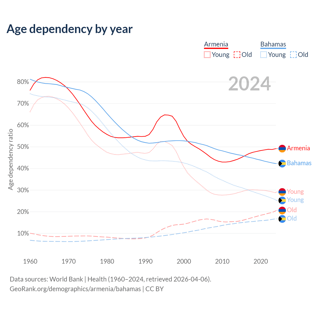 The share of older people aged 65 and over is 13.7% in Armenia and 11.8% in the Bahamas. Life expectancy in Armenia compared to the Bahamas .