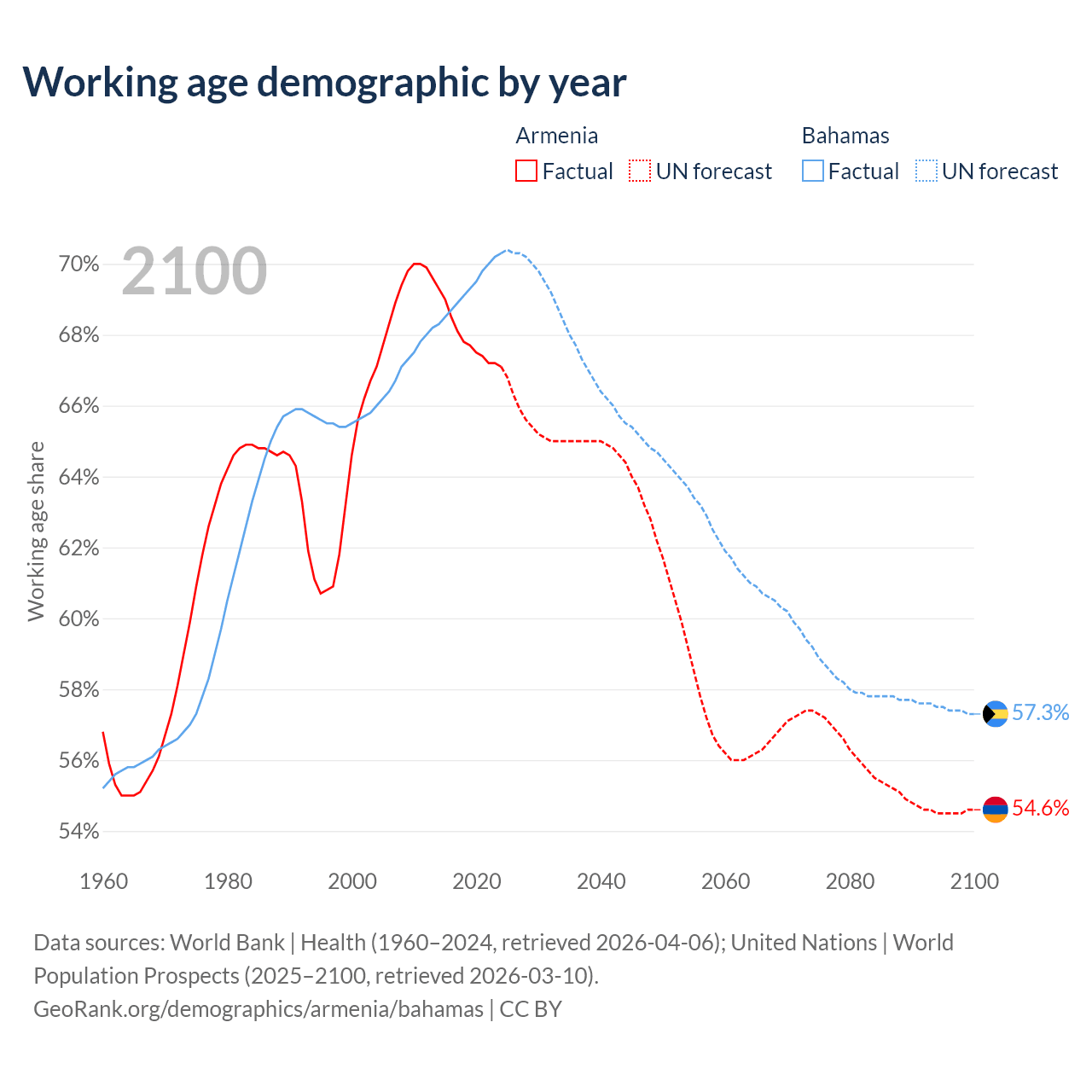 Median age Armenia vs Bahamas, 1960-2100